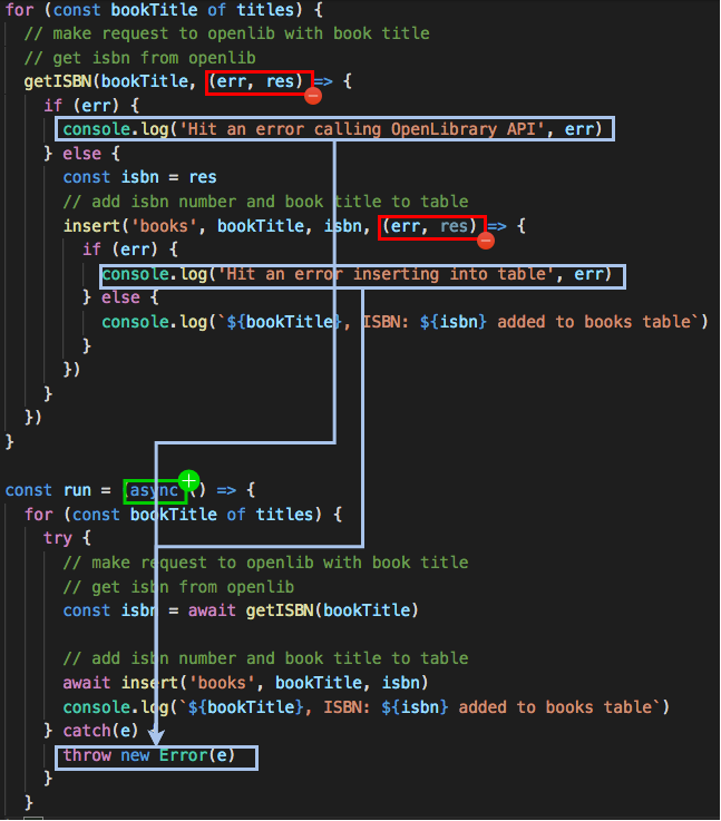 One thing to note here for this last bit of code, for the async/await version is that if there is an error in the getJSON function call, it will be caught by the catch(e) block and the function will exit. The insert function won't be called. We could have wrapped each await call in its own try/catch too, if we wanted to avoid this behavior. It just depends on the needs of the code/feature you're working on.