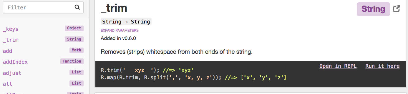 As an example, the functional programming library Ramda has great docs for its API, including a REPL that allows you to run the examples and play around with the library right in the browser!