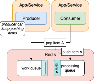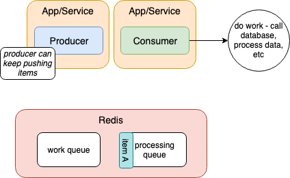 While the producer is doing it's thing, the consumer will pop the next item off the work queue and push it into the processing queue.