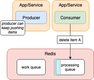 After the item has been successfully processed, only then will it be removed from the processing queue. We'll get into this when we look at the code, but it will use the Redis command `lrem` to remove it. This command doesn't pop the item off the queue but removes it entirely.